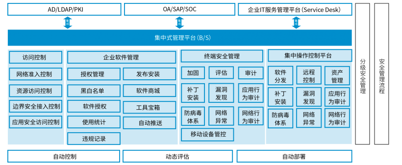 部署該系統(tǒng)后,可對上海國際信托的接入安全、桌面安全、使用安全進行統(tǒng)一的管控和審計。企業(yè)不必再擔心辦公終端成為外部入侵與攻擊的目標和入口,同時分級部署、策略下發(fā)、訪問控制、補丁管理、移動存儲等功能和大數(shù)據(jù)引擎的加持在保障上海國際信托基本需求的同時,讓體驗更進一步。