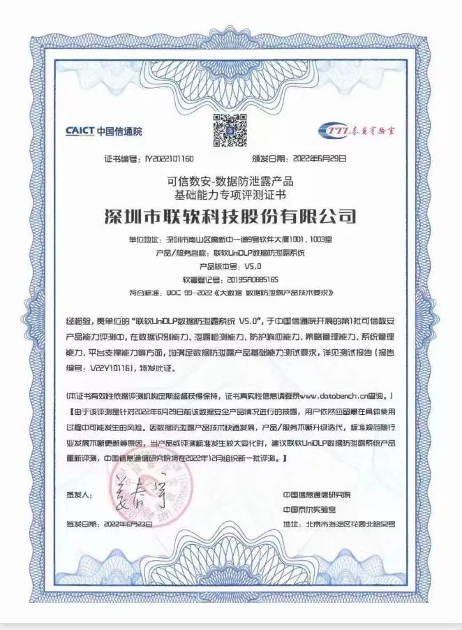 7月8日,首批“可信數(shù)安”評(píng)估評(píng)測(cè)結(jié)果公布,來自多位中國(guó)信息通信研究院、中國(guó)科學(xué)院信息工程研究所的專家評(píng)審后,聯(lián)軟科技UniDLP數(shù)據(jù)防泄密系統(tǒng)通過首批“可信數(shù)安”評(píng)估評(píng)測(cè)。