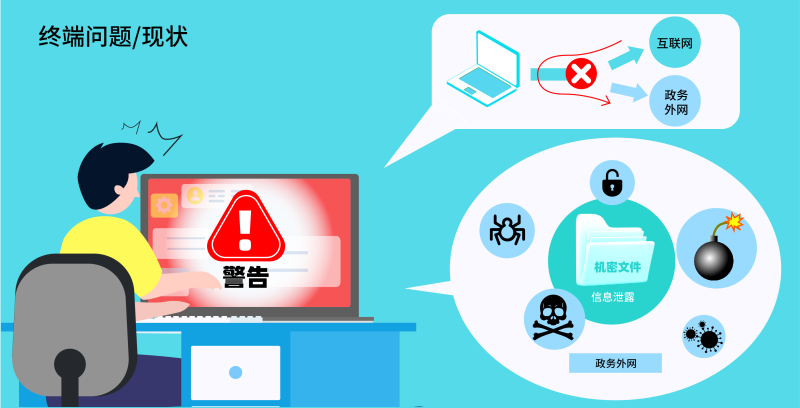 當(dāng)前,部分政務(wù)部門已完成終端安全建設(shè),但終端安全技術(shù)路線未統(tǒng)一,安全效果強(qiáng)弱不一,無法保障安全與使用相結(jié)合。同時,傳統(tǒng)防護(hù)方式針對終端側(cè)數(shù)據(jù)落地缺乏保障,基本對內(nèi)部完全信任不設(shè)防,對導(dǎo)入導(dǎo)出等泄露政務(wù)外網(wǎng)敏感數(shù)據(jù)的行為缺乏有效管控,數(shù)據(jù)泄密事件頻發(fā)。
