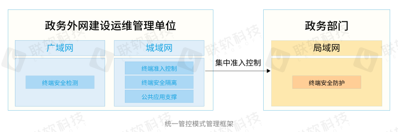 按照“全盤統(tǒng)籌、多級部署、分層管控、屬地管理”的原則,根據(jù)政務(wù)外網(wǎng)業(yè)務(wù)是否集中部署的場景,聯(lián)軟推出兩種政務(wù)外網(wǎng)終端“一機(jī)兩用”安全管控方案: