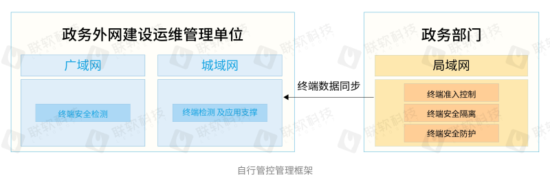 自行管控模式管理框架包括:負(fù)責(zé)終端安全防護(hù),包括終端準(zhǔn)入控制、終端安全隔離和終端安全防護(hù);在城域網(wǎng)邊界實(shí)施終端檢測、應(yīng)用支撐和安全集中監(jiān)控,在廣域網(wǎng)邊界實(shí)施終端安全檢測;將終端管控相關(guān)管理數(shù)據(jù)同步給所在層級的政務(wù)外網(wǎng)建設(shè)運(yùn)維管理單位。