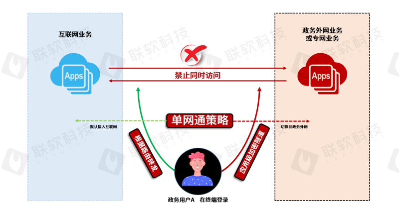 網(wǎng)絡(luò)隔離:聯(lián)軟的“一機(jī)兩用”政務(wù)外網(wǎng)終端管控方案,打破“一機(jī)多用”現(xiàn)狀,對接入政務(wù)外網(wǎng)終端實(shí)現(xiàn)網(wǎng)絡(luò)隔離,實(shí)現(xiàn)同一臺終端無法同時訪問兩張網(wǎng)絡(luò),如終端在訪問互聯(lián)網(wǎng)時,無法訪問政務(wù)外網(wǎng)。當(dāng)此終端訪問政務(wù)外網(wǎng)時,無法訪問互聯(lián)網(wǎng)。