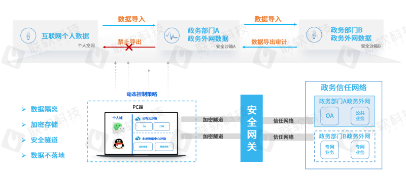 作為Forrester《零信任最佳實(shí)踐》白皮書主要參編單位之一、國內(nèi)率先落地基于“零信任安全”產(chǎn)品的廠商之一,聯(lián)軟科技充分利用自身在零信任安全領(lǐng)域的深厚技術(shù)實(shí)力及豐富的落地實(shí)踐經(jīng)驗(yàn),結(jié)合多年在端點(diǎn)安全管控方案的積累,為各級政務(wù)提供先進(jìn)、合規(guī)的政務(wù)外網(wǎng)一機(jī)兩用解決方案,解決政務(wù)外網(wǎng)應(yīng)用和終端安全防護(hù)難題。