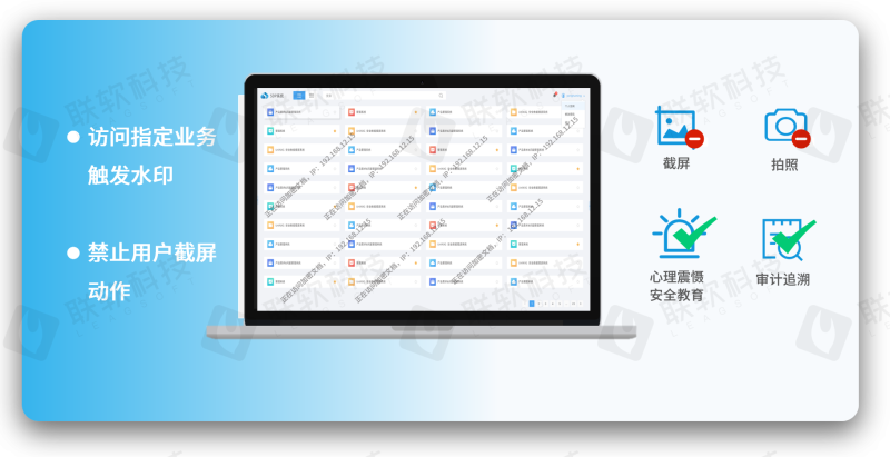 追蹤溯源:考慮到用戶拍照等泄密行為,對于重要的業(yè)務(wù)數(shù)據(jù)或特殊政務(wù)外網(wǎng)業(yè)務(wù)系統(tǒng),可采用屏幕水印技術(shù),防止拍照后無法溯源,同時也可對終端用戶啟動心理震懾作用。支持多種專利水印技術(shù),可支持移動終端和PC終端屏幕顯示。