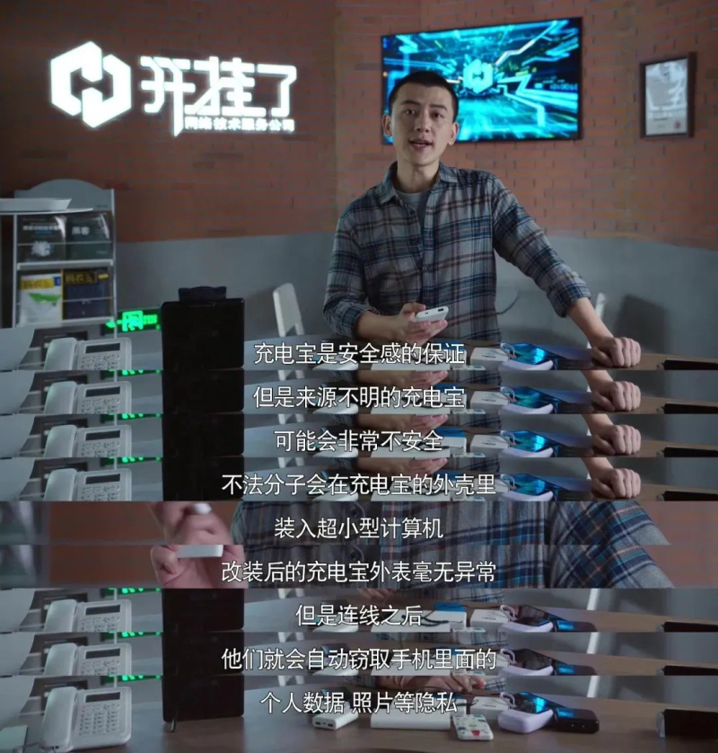 其中,對于個人信息泄露,《你安全嗎?》劇中展現(xiàn)了幾個非常典型的場景。劇中第一集就展示了在公共場所使用來源不明的充電寶有被竊取數(shù)據(jù)的風險,威脅個人信息安全。