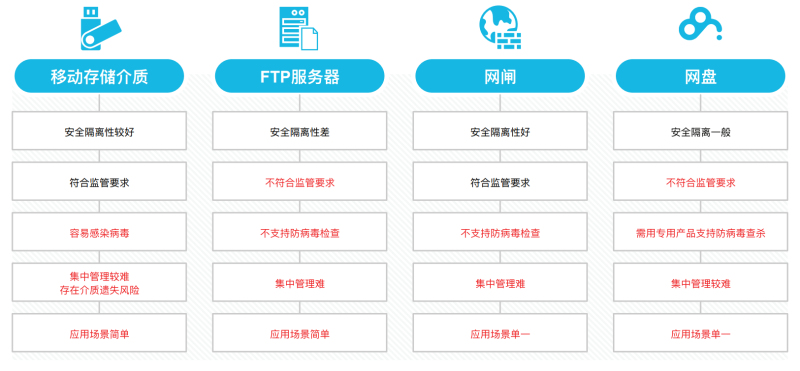 對(duì)比網(wǎng)絡(luò)共享、FTP、U盤等傳統(tǒng)方案,聯(lián)軟安渡UniNXG安全數(shù)據(jù)交換系統(tǒng),提供高效文件跨網(wǎng)上傳下載分享,并可實(shí)現(xiàn)數(shù)據(jù)防泄漏、病毒木馬查殺、文檔交換行為審計(jì),文件交換審批等能力。