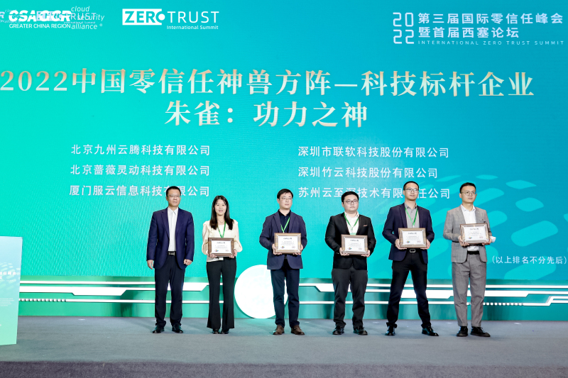 11月3日,由國際云安全聯(lián)盟大中華區(qū)(CSA GCR)聯(lián)合湖州市吳興區(qū)人民政府與湖州市大數(shù)據(jù)發(fā)展管理局共同主辦的第三屆國際零信任峰會隆重召開。會上,重磅發(fā)布了《中國零信任神獸方陣報告(2022)》,聯(lián)軟科技憑借強(qiáng)大的技術(shù)創(chuàng)新能力以及亮眼的市場表現(xiàn),榮獲2022中國零信任神獸方陣-科技標(biāo)桿企業(yè)稱號,位居“朱雀-功力之神”。