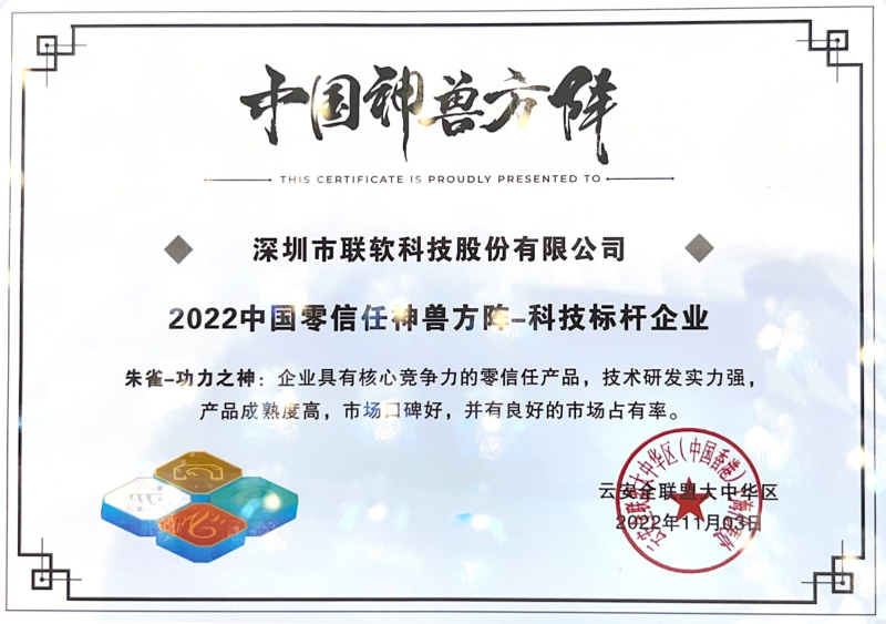 ▲聯(lián)軟榮獲2022中國零信任神獸方陣-科技標(biāo)桿企業(yè)稱號,入選朱雀方陣