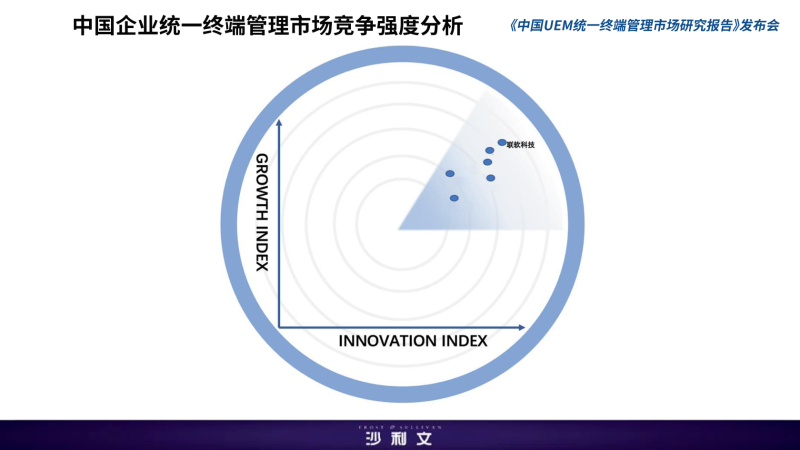 11月30日,全球最大的企業(yè)增長咨詢公司弗若斯特沙利文( Frost & Sullivan ,簡稱“沙利文”) 正式發(fā)布了《中國UEM統(tǒng)一終端管理市場研究報告》。沙利文通過對中國UEM統(tǒng)一終端管理市場的深度調(diào)研和分析,以及對業(yè)內(nèi)相關(guān)企業(yè)、產(chǎn)品競爭力情況的研究和評估,基于創(chuàng)新指數(shù)和增長指數(shù)兩大評價維度,分析中國統(tǒng)一終端管理主流廠商在市場中的競爭力情況,最終報告顯示聯(lián)軟科技在中國UEM統(tǒng)一終端管理領(lǐng)域中占據(jù)領(lǐng)導(dǎo)者位置 。