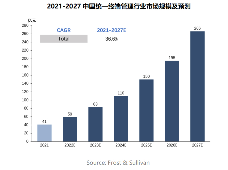 近年來,由于大量的非傳統(tǒng)連接設(shè)備的增加,居家辦公(WFH)和BYOD的管理策略的興起,以及5G和云計算的廣泛應(yīng)用等因素,企業(yè)移動端設(shè)備的使用量激增,從而促進統(tǒng)一終端管理市場的規(guī)模增長。弗若斯特沙利文研究預(yù)計至2027年中國統(tǒng)一終端管理行業(yè)市場規(guī)模將達266億元,2021年至2027年的年復(fù)合增長率為36.6%。