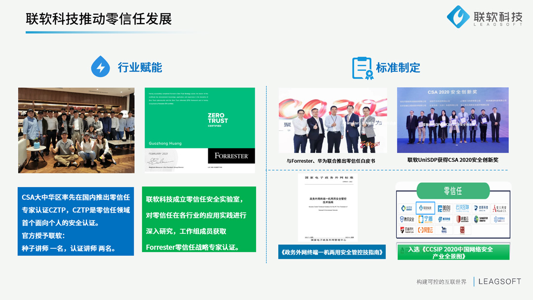 聯(lián)軟參與編寫了國內(nèi)首個零信任技術(shù)標(biāo)準(zhǔn)發(fā)布;聯(lián)軟3名專家獲CSA大中華區(qū)零信任專家認(rèn)證CZTP;榮獲知名研究機(jī)構(gòu)Forrester零信任認(rèn)證;UniSDP安界軟件定義邊界系統(tǒng)榮獲“CSA2020安全創(chuàng)新獎”;入選《IDC創(chuàng)新者:零信任之軟件定義邊界與微隔離技術(shù),2021》,榮獲零信任領(lǐng)域“IDC Innovator”;入選CSA《2022中國零信任神獸方陣》報告,被評為“朱雀-功力之神”科技標(biāo)桿企業(yè);在行業(yè)安全媒體零信任細(xì)分領(lǐng)域榜單中屢屢上榜……