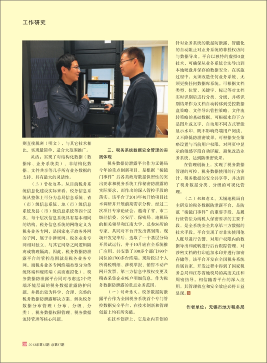 稅務(wù)數(shù)據(jù)防泄露平臺(tái)作為無(wú)錫局今年的重點(diǎn)創(chuàng)新項(xiàng)目,是根據(jù)“棱鏡門(mén)時(shí)間”后各類(lèi)政府?dāng)?shù)據(jù)保密性的突出要求和稅務(wù)系統(tǒng)工作秘密防泄露的實(shí)際要求,而做出的深入管控手段落實(shí)。該平臺(tái)于2013年初開(kāi)始項(xiàng)目技術(shù)調(diào)研并開(kāi)展前期需求分析,經(jīng)過(guò)二次項(xiàng)目專(zhuān)家論證會(huì),邀請(qǐng)了省、市二級(jí)經(jīng)信委、公安廳、保密局、地稅局的相關(guān)領(lǐng)導(dǎo)和江南大學(xué)、總參56所得專(zhuān)家,共同對(duì)平臺(tái)開(kāi)發(fā)出謀劃策?,F(xiàn)場(chǎng)開(kāi)發(fā)完畢后,選取了一個(gè)基層分局開(kāi)展試運(yùn)行,并于10月底在全系統(tǒng)推廣應(yīng)用,共安裝了330多個(gè)部門(mén)390個(gè)崗位的1700多臺(tái)終端?,F(xiàn)階段以個(gè)人所得稅明細(xì)、涉稅舉報(bào)、銷(xiāo)售不動(dòng)產(chǎn)網(wǎng)開(kāi)發(fā)票、第三方信息中股權(quán)變更及稽查采集企業(yè)賬戶明細(xì)信息,作為稅務(wù)數(shù)據(jù)防泄露的重點(diǎn)業(yè)務(wù)范圍。
