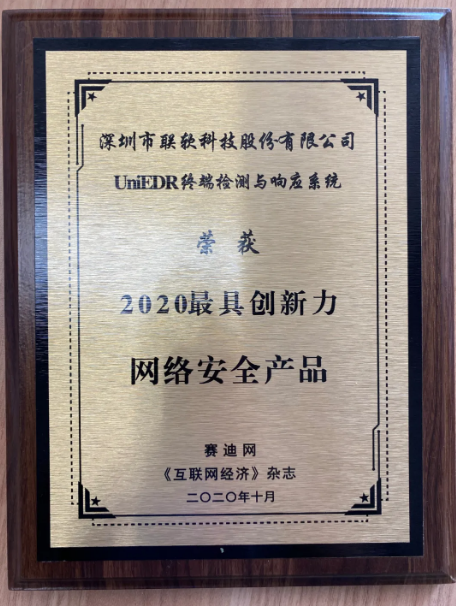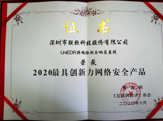 在峰會(huì)上,由賽迪網(wǎng)發(fā)起,聯(lián)合《互聯(lián)網(wǎng)經(jīng)濟(jì)》雜志社、賽迪呼叫等機(jī)構(gòu),以及著名行業(yè)專(zhuān)家共同定制行業(yè)信息化領(lǐng)域高級(jí)別、權(quán)威性的競(jìng)爭(zhēng)力評(píng)價(jià)指標(biāo)體系,歷經(jīng)數(shù)月的準(zhǔn)備和評(píng)審,2020行業(yè)信息化百?gòu)?qiáng)已新鮮出爐,評(píng)出行業(yè)內(nèi)創(chuàng)新力突出的企業(yè)、人物及產(chǎn)品等。聯(lián)軟科技UniEDR終端檢測(cè)與響應(yīng)系統(tǒng)榮獲2020最具創(chuàng)新力網(wǎng)絡(luò)安全產(chǎn)品證書(shū)。