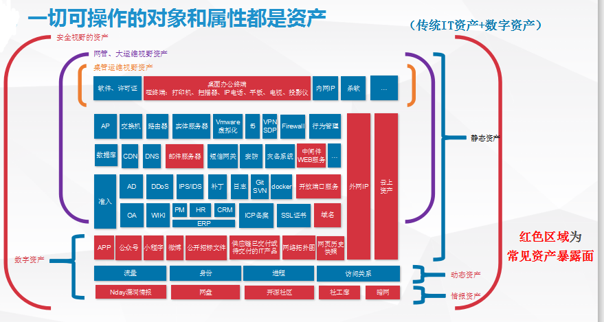 對(duì)資產(chǎn)而言,看待的視角不同,關(guān)注的資產(chǎn)范疇也不一樣。下圖中顯示了桌面管理視角、IT運(yùn)維視角的資產(chǎn)、安全視角等如何看資產(chǎn)。其中從安全視角出發(fā),包括關(guān)注傳統(tǒng)IT資產(chǎn)和數(shù)字資產(chǎn),靜態(tài)資產(chǎn)、動(dòng)態(tài)資產(chǎn)、情報(bào)資產(chǎn)等可能被攻擊者利用或損害的所有資產(chǎn)。