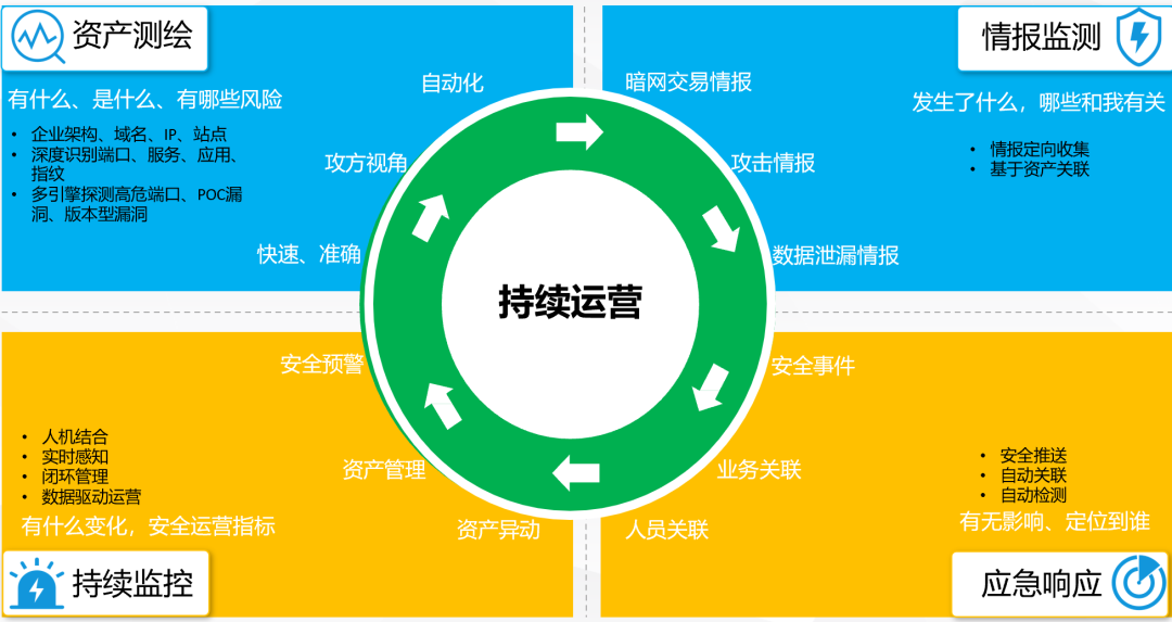 UniCSM基于以資產(chǎn)為核心的安全運(yùn)營模型,以資產(chǎn)測繪為起點(diǎn),結(jié)合情報(bào)監(jiān)測、應(yīng)急響應(yīng)和持續(xù)監(jiān)控,實(shí)現(xiàn)對(duì)資產(chǎn)的持續(xù)安全運(yùn)營,解決網(wǎng)絡(luò)空間有什么、是什么、有什么風(fēng)險(xiǎn)、哪些業(yè)務(wù)和責(zé)任人有關(guān),風(fēng)險(xiǎn)解決的優(yōu)先級(jí)如何等問題,并可實(shí)現(xiàn)整體資產(chǎn)和脆弱性態(tài)勢感知。