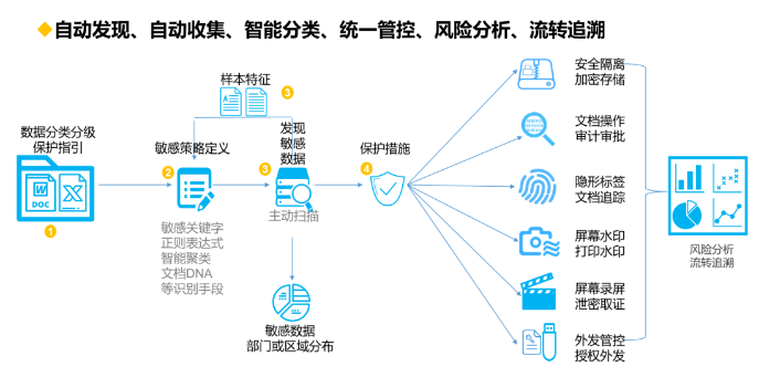 ●建立了網(wǎng)絡邊界防護、終端系統(tǒng)防護、數(shù)據(jù)發(fā)現(xiàn)及評估、數(shù)據(jù)分類分級、實施數(shù)據(jù)防護、審計監(jiān)控及報告等六大流程組成的文件保護管理體系;
