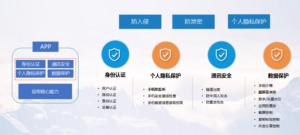 以上能力支持SDK集成和應(yīng)用wrapping兩種方式,能幫助客戶實現(xiàn)安全與業(yè)務(wù)融合,安全隱藏于業(yè)務(wù)背后的原生安全。在安全效果上,實現(xiàn)了對移動應(yīng)用的完整的保護(hù),提供抗攻擊、敏感數(shù)據(jù)保護(hù)、個人隱私保護(hù)的全面能力。