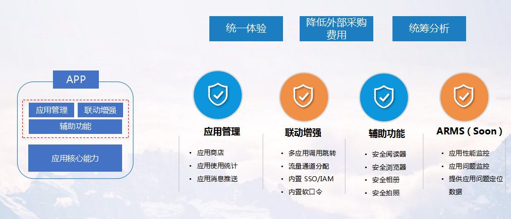 在安全能力之外,聯(lián)軟還提供了一些功能組件,如應(yīng)用的管理,移動應(yīng)用的單點登錄和IAM能力,另外對應(yīng)用的性能監(jiān)控也在開發(fā)中。通過以上這些功能組件,可以幫助客戶實現(xiàn)統(tǒng)一的移動應(yīng)用使用體驗,降低外部采購費用,對移動應(yīng)用的使用和運營情況進(jìn)行統(tǒng)籌分析。