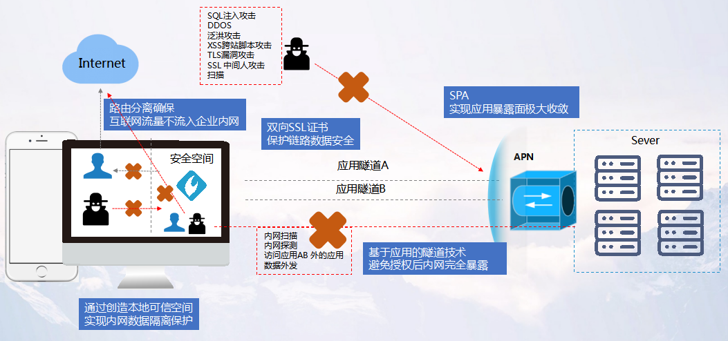 關(guān)于平臺的防入侵能力,首先通過APN實現(xiàn)了移動應(yīng)用暴露面的極大收斂,所有移動應(yīng)用通過一個的域名接入。同時使用SPA單包授權(quán)技術(shù)對APN網(wǎng)關(guān)進(jìn)行端口隱藏。不僅如此,在移動應(yīng)用與APN建立連接的過程中,還進(jìn)行了雙向證書校驗,能夠完全防止SSL中間人攻擊。