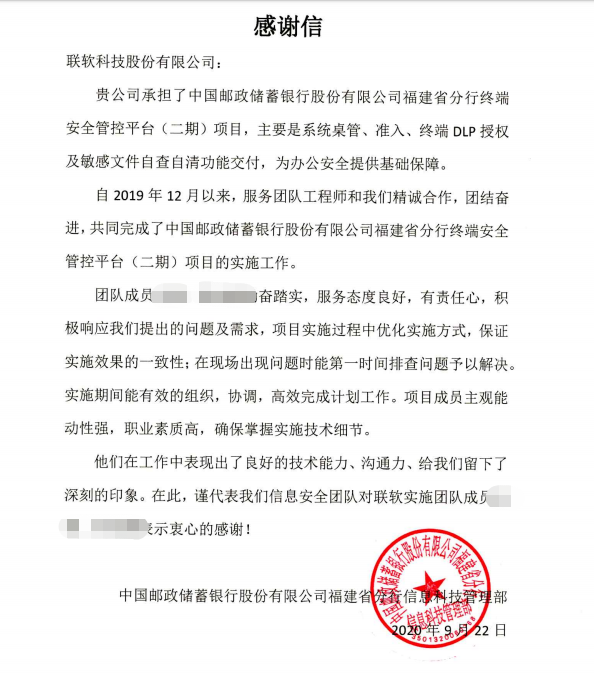 對(duì)于中國郵儲(chǔ)銀行(福建分行)發(fā)來的感謝信,聯(lián)軟科技也感到十分的榮幸,并感謝相關(guān)部門同事在此次項(xiàng)目實(shí)施過程當(dāng)中給予的各方面支持。