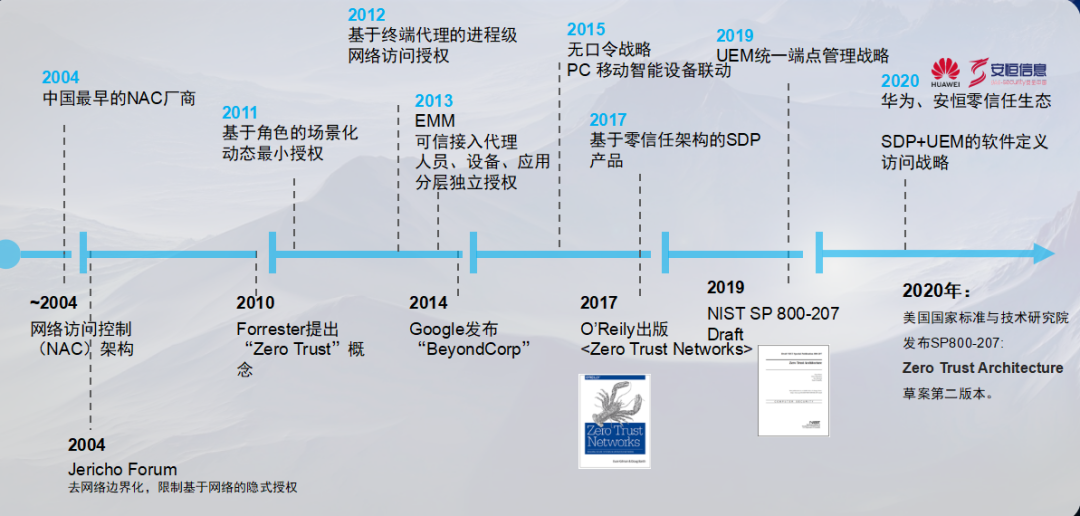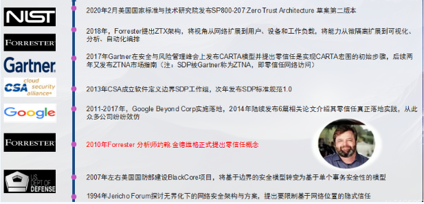 基于上述原因,為了讓制造業(yè)企業(yè)數(shù)字化轉(zhuǎn)型中建立起安全、高效的網(wǎng)絡(luò)防護,企業(yè)迫切需要新的網(wǎng)絡(luò)安全架構(gòu)—零信任。先來看看零信任的發(fā)展史,2010年,F(xiàn)orrester 分析師約翰·金德維格正式提出零信任概念,自此零信任開始嶄露頭角,在其發(fā)展完善的10年過程中,F(xiàn)orrester 、NIST、Google、Gartner、CSA等機構(gòu)都扮演了重要的角色,一步步將零信任推向成熟。其中2020年3月發(fā)布的NIST NCCoE 《實現(xiàn)零信任架構(gòu)》草案版,2020年10月發(fā)布的NIST NCCoE 《實現(xiàn)零信任架構(gòu)》正式版,代表著零信任已經(jīng)從理念走向工程實踐甚至標準化。