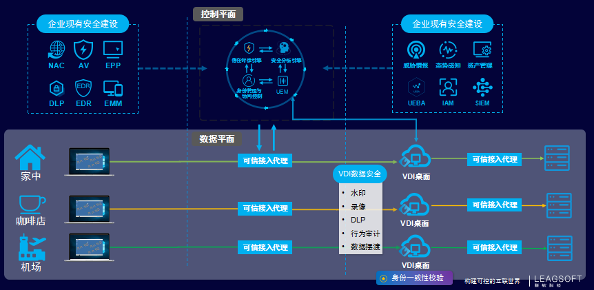 以聯(lián)軟科技UniSDP軟件定義邊界系統(tǒng)為核心的零信任遠程辦公解決方案,包含控制器、安全網(wǎng)關(guān)、可信客戶端三大核心組件,基于零信任理念,運用細粒度訪問控制技術(shù)、動態(tài)授權(quán)體系、SPA單包授權(quán)協(xié)議、多域安全沙箱,通過模塊化平臺架構(gòu)和開放的生態(tài)合作體系,不僅在安全上實現(xiàn)了企業(yè)網(wǎng)絡(luò)隱身,最大化的減少企業(yè)網(wǎng)絡(luò)暴露面,而且通過終端安全檢查、動態(tài)授權(quán),保障企業(yè)接入的安全。實現(xiàn)企業(yè)終端統(tǒng)一管理、用戶統(tǒng)一管理、應(yīng)用統(tǒng)一管理、策略統(tǒng)一管理、安全統(tǒng)一管理。同時也能與VDI產(chǎn)品無縫結(jié)合,打造更安全的遠程接入方案。