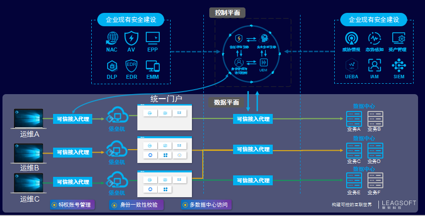 聯(lián)軟科技推出基于零信任理念的遠程運維解決方案,以UniSDP軟件定義邊界系統(tǒng)為核心,在正式接入運維前,通過SPA預(yù)認證技術(shù),對運維人員身份以及遠程運維終端進行身份合法性校驗,并且對運維終端進行安全接入檢查,確保環(huán)境及身份安全可信后授權(quán)接入。在遠程運維過程中,對運維終端進行持續(xù)信任評估,確保接入環(huán)境安全;通過安全沙箱對數(shù)據(jù)中心資源進行安全防護,以免造成敏感數(shù)據(jù)泄露。在整個運維周期間,對接入、訪問、操作、退出等行為進行全面的審計記錄,遠程運維結(jié)束后為管理員提供豐富的審計數(shù)據(jù),可及時發(fā)現(xiàn)問題并溯源。