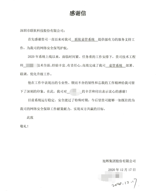 近日,聯(lián)軟科技收到了旭輝集團股份有限公司(旭輝集團)發(fā)來的感謝信。信中對我司聯(lián)軟桌管系統(tǒng)的服務(wù)支持工作給予了高度評價。以下為感謝信: