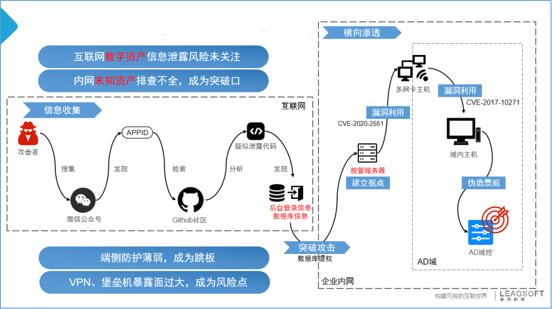 今年我們在參與企業(yè)攻防演習(xí)中,碰到了企業(yè)對于互聯(lián)網(wǎng)資產(chǎn)梳理的需求,其實在以往與客戶的交流中,我們就發(fā)現(xiàn)很多企業(yè)忽略了社交媒體的重要性,容易給企業(yè)網(wǎng)絡(luò)安全留下了隱患,也容易給攻防演練行動留下缺口。以往年攻防演練行動攻擊為案例,攻擊者可通過收集到微信公眾號AppID,將AppID錄入數(shù)據(jù)泄露監(jiān)控模塊中,發(fā)現(xiàn)github有配置信息泄露,包含內(nèi)網(wǎng)信息,最終達到突破攻擊的效果。