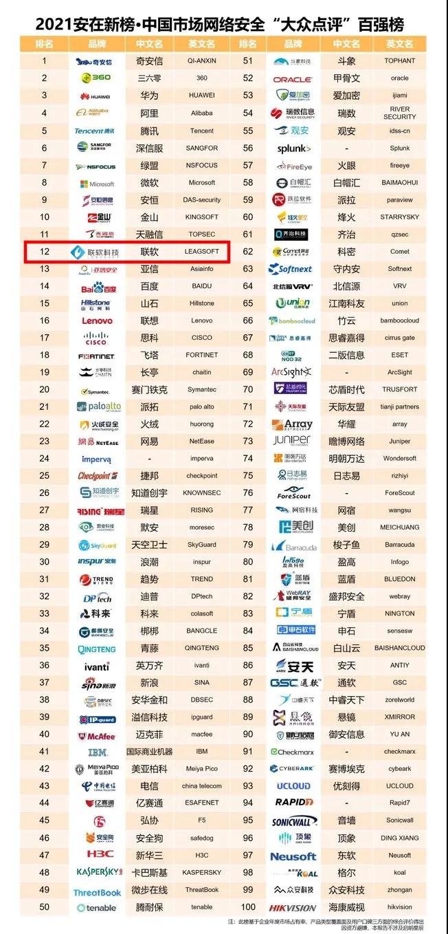 ●《2021安在新榜·中國市場網(wǎng)絡(luò)安全“大眾點(diǎn)評” 百強(qiáng)榜》基于網(wǎng)絡(luò)安全廠商年度的市場占有率、產(chǎn)品類型的覆蓋面及用戶企業(yè)反饋的口碑三方面進(jìn)行綜合評價(jià),呈現(xiàn)出網(wǎng)絡(luò)安全用戶對目前在中國市場內(nèi)比較活躍的網(wǎng)絡(luò)安全廠商及產(chǎn)品的認(rèn)知。