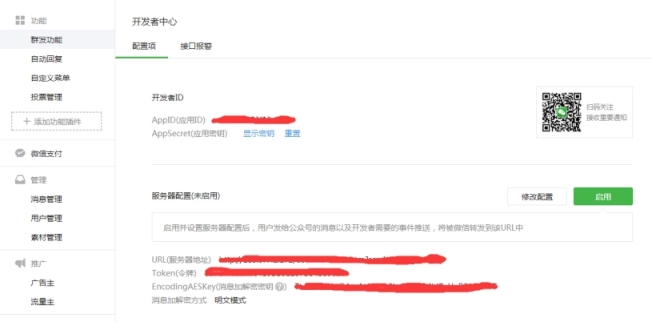 接下來(lái),在微信公眾后臺(tái)點(diǎn)擊“開(kāi)發(fā)者中心”, 在配置項(xiàng)中填入接口相應(yīng)URL和Token。