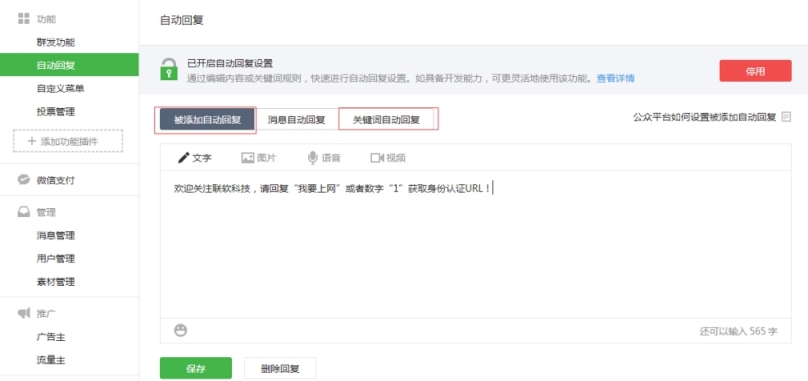 微信管理后臺(tái)“自動(dòng)回復(fù)”中設(shè)置“被添加自動(dòng)回復(fù)”和“關(guān)鍵詞自動(dòng)回復(fù)”。