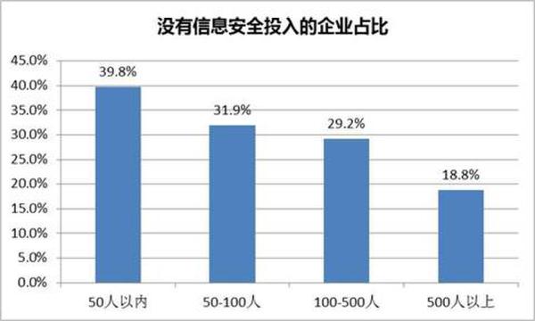 調(diào)查數(shù)據(jù)顯示,23.9%的企業(yè)沒有信息安全團(tuán)隊(duì),30.3%的企業(yè)每年基本上沒有信息安全預(yù)算,小微企業(yè)尤其是小微金融企業(yè)在這方面更加摳門,接近40%的小微企業(yè)(100人以下)沒有信息安全團(tuán)隊(duì)和資金預(yù)算,超過50%的金融企業(yè)沒有任何安全方面的投入。與之相對(duì)的,互聯(lián)網(wǎng)與電信行業(yè)在信息安全建設(shè)方面則已經(jīng)有較好的基礎(chǔ),這些企業(yè)超過76%有信息安全方面的專項(xiàng)投入。