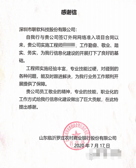 對于羅莊農村商業(yè)銀行發(fā)來的感謝信,聯(lián)軟科技感到十分的榮幸,并感謝羅莊農村商業(yè)銀行相關部門同事在此次項目實施過程當中給予的各方面支持。