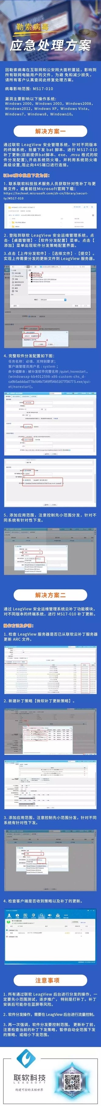 1、請(qǐng)立即通過(guò)聯(lián)軟管控中心下發(fā)補(bǔ)丁更新檢查策略,查找所有未修復(fù)MS17-010補(bǔ)丁的電腦,一旦發(fā)現(xiàn)有未修復(fù)此補(bǔ)丁的電腦,立即通過(guò)聯(lián)軟準(zhǔn)入控制進(jìn)行網(wǎng)絡(luò)隔離,并在隔離區(qū)通過(guò)補(bǔ)丁管理功能進(jìn)行補(bǔ)丁分發(fā)。