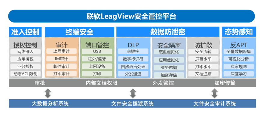 經(jīng)過14年在網(wǎng)絡(luò)安全領(lǐng)域的技術(shù)積累,和大量的企業(yè)內(nèi)網(wǎng)安全體系建設(shè)項(xiàng)目經(jīng)驗(yàn),聯(lián)軟科技推出的LeagView安全管控平臺(tái),從準(zhǔn)入控制、終端安全、數(shù)據(jù)防泄密、事態(tài)感知等四大方面提供安全保護(hù),可以有效滿足企業(yè)內(nèi)網(wǎng)數(shù)據(jù)安全防護(hù)的需求,有效幫助企業(yè)建設(shè)完善的安全體系。