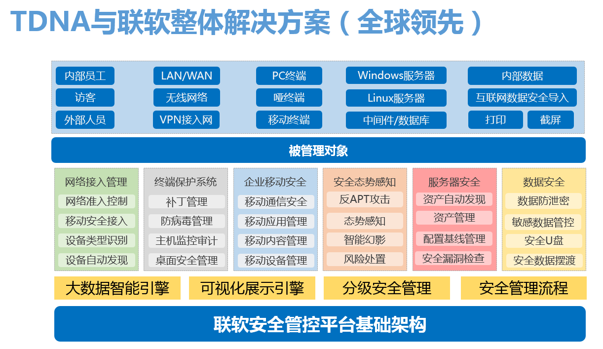 除了上述入圍產(chǎn)品,聯(lián)軟擁有強(qiáng)大的基于TDNA可信數(shù)字網(wǎng)絡(luò)架構(gòu)的ESPP平臺(tái)級(jí)統(tǒng)一管控平臺(tái),整套平臺(tái)置于聯(lián)軟自主研發(fā)的大數(shù)據(jù)平臺(tái)之上,可以更好地為用戶提供數(shù)據(jù)的存儲(chǔ)和查找。