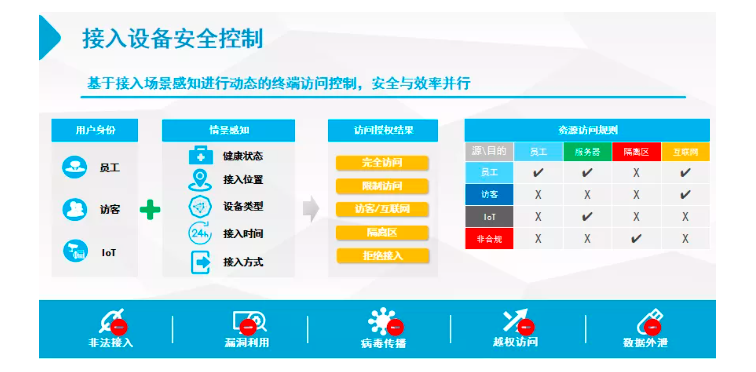 對(duì)接入網(wǎng)絡(luò)設(shè)備(含連入內(nèi)網(wǎng)的終端計(jì)算機(jī)、網(wǎng)絡(luò)打印機(jī)、網(wǎng)絡(luò)攝像頭、IP電話等啞終端等具有IP地址的設(shè)備)進(jìn)行合規(guī)化管理,對(duì)接入終端進(jìn)行認(rèn)證,確保終端合法才能接入網(wǎng)絡(luò)。通過對(duì)接入終端進(jìn)行相應(yīng)的網(wǎng)絡(luò)訪問權(quán)限控制,防止越權(quán)訪問。