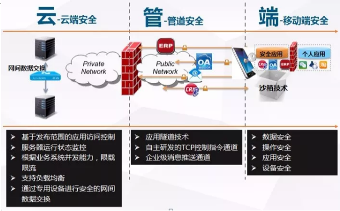 1、智能移動設(shè)備邊界安全控制:從移動終端、安全隧道、管理平臺三部分對企業(yè)實行移動安全門戶統(tǒng)一入口,統(tǒng)一雙向認證、終端安全檢查、單點登錄,通過內(nèi)置的安全沙箱實現(xiàn)個人數(shù)據(jù)和企業(yè)數(shù)據(jù)隔離,并對企業(yè)數(shù)據(jù)采用高強度加密手段,防止數(shù)據(jù)被非法獲取和泄露,同時對數(shù)據(jù)安全通道實行應(yīng)用隔離,對數(shù)據(jù)進行端到端加密,確保數(shù)據(jù)傳輸安全。另外,此次提供的解決方案本身還采用了業(yè)界領(lǐng)先的微服務(wù)技術(shù)架構(gòu),可以根據(jù)用戶業(yè)務(wù)能力進行橫向擴展,并將所有微服務(wù)在云端進行集中管控,適應(yīng)多中心云部署需要。