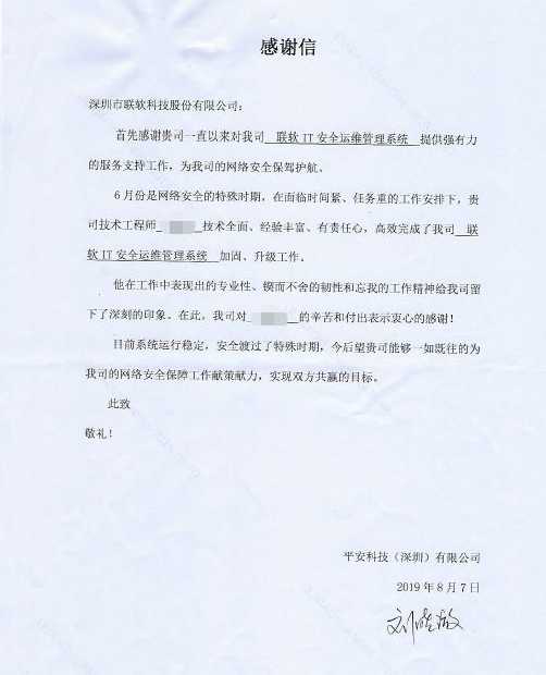信中對于我司此次所承擔(dān)的IT安全運(yùn)維管理系統(tǒng)的服務(wù)支持工作給予了高度評價(jià)。并表示,在6月份網(wǎng)絡(luò)安全的特殊時(shí)期,此次的項(xiàng)目的加固升級為平安科技的網(wǎng)絡(luò)安全提供了必要的保障和護(hù)航作用。