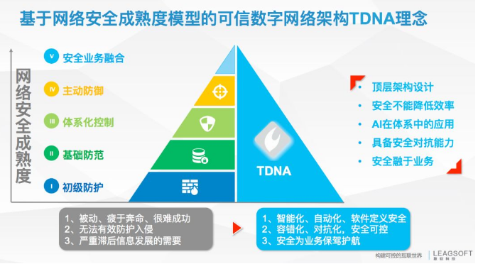 “構(gòu)建可控的互聯(lián)世界”是聯(lián)軟的愿景,在幫助企業(yè)建立全面堅(jiān)固的網(wǎng)絡(luò)安全防護(hù)時(shí),聯(lián)軟也努力將安全與效率相統(tǒng)一。在“可信數(shù)字網(wǎng)絡(luò)架構(gòu)TDNA”(Trusted Digital Network Architecture)的理念下,將安全融于業(yè)務(wù),做到事前、事中、事后的不同策略。