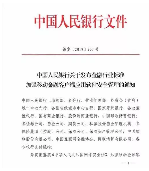 目前,加大金融APP違規(guī)行為打擊力度正在填材料、申請備案中。據(jù)悉,央行此前已向部分金融機構定向下發(fā)《關于發(fā)布金融行業(yè)標準加強移動金融客戶端應用軟件安全管理通知》(237號文)。