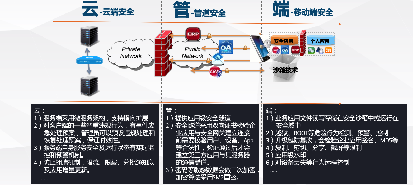 除了利用應用限制策略從源頭解決金融類APP的信息與數(shù)據(jù)安全問題外,UniEMM可幫助企業(yè)解決在向移動辦公拓展過程中面臨的安全、管理以及部署等各種挑戰(zhàn),通過身份可識別、設備靈活管理、設備安全接入、杜絕數(shù)據(jù)泄密、建立企業(yè)應用商店、打造企業(yè)辦公門戶等關鍵點,為企業(yè)提供端到端的安全管理解決方案,能夠支持企業(yè)現(xiàn)有業(yè)務的移動化安全保護,并支持未來業(yè)務的移動化創(chuàng)新,將安全與高效相統(tǒng)一。