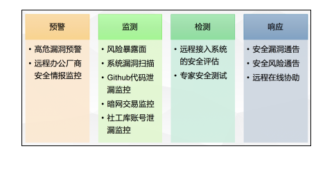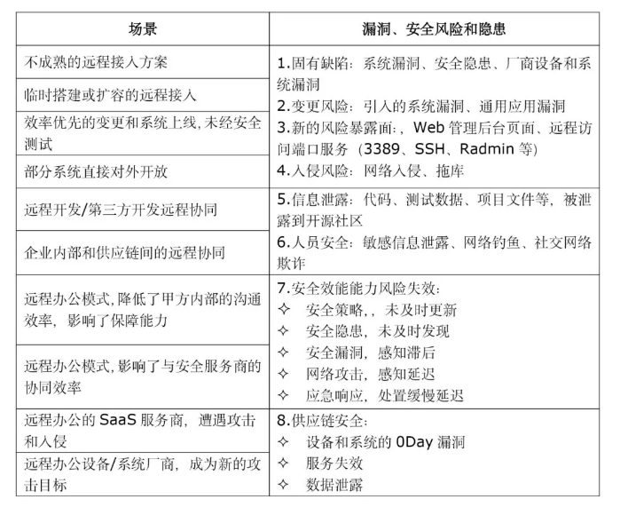 總體而言,在保障業(yè)務(wù)、效率優(yōu)先的前提下,遠(yuǎn)程辦公模式有可能在以下場(chǎng)景中,引入新的安全風(fēng)險(xiǎn)、漏洞和隱患,或遭遇安全失效的風(fēng)險(xiǎn)。