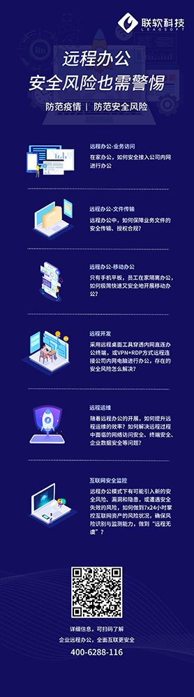 疫情期間,聯(lián)軟為您解決多種遠(yuǎn)程辦公安全問(wèn)題,保障企業(yè)業(yè)務(wù)順利進(jìn)行,有需求的企業(yè)用戶可掃描下方二維碼直接申請(qǐng)?jiān)囉?,或撥?00-6288-116咨詢,聯(lián)軟網(wǎng)絡(luò)安全專家為您服務(wù)!