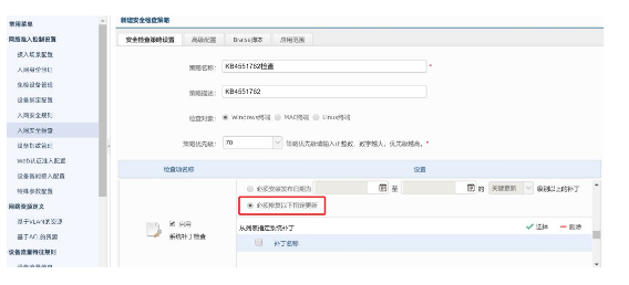 部署聯(lián)軟UniNAC網(wǎng)絡準入控制系統(tǒng)的用戶,針對此次漏洞,可在入網(wǎng)安全檢查規(guī)則中,增加對KB4551762的檢查,且要求更新安裝指定補丁后才允許入網(wǎng),在網(wǎng)絡邊界構筑安全防護。