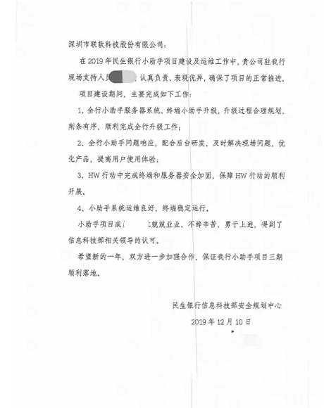 聯(lián)軟科技收到了民生銀行信息科技部安全規(guī)劃中心發(fā)來的感謝信。