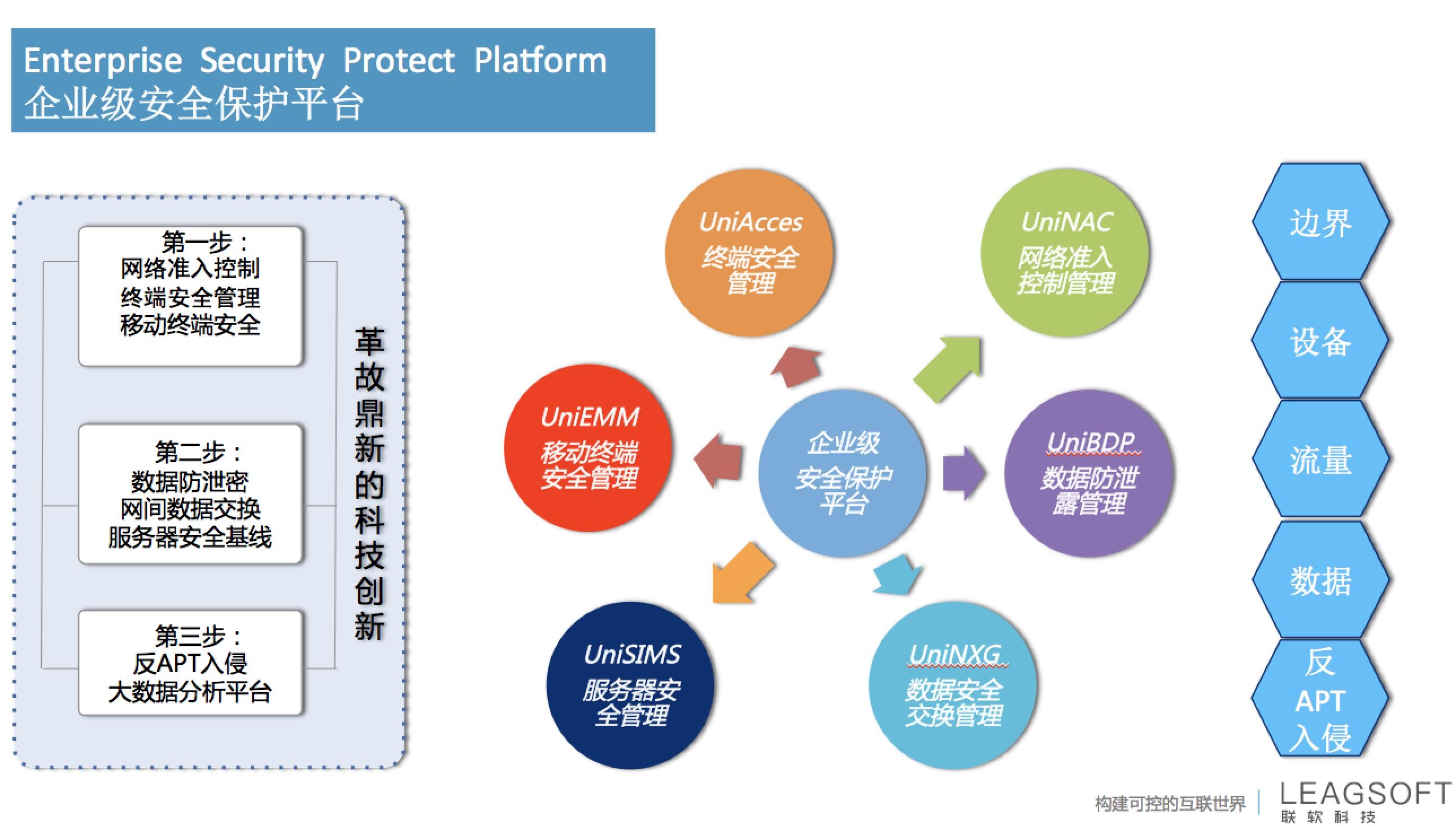 從產(chǎn)品形態(tài)上來(lái)說(shuō),聯(lián)軟的所有產(chǎn)品都集成ESPP上,在這個(gè)平臺(tái)上有6大子產(chǎn)品,分別是網(wǎng)絡(luò)準(zhǔn)入控制、業(yè)務(wù)數(shù)據(jù)防泄露、網(wǎng)間數(shù)據(jù)安全擺渡、終端安全管理、企業(yè)移動(dòng)管理、服務(wù)器安全管理這六大產(chǎn)品,覆蓋了從網(wǎng)絡(luò)邊界的安全,PC終端、移動(dòng)終端及啞終端的設(shè)備安全,到數(shù)據(jù)的安全,服務(wù)器安全及反APT攻擊的產(chǎn)品等。