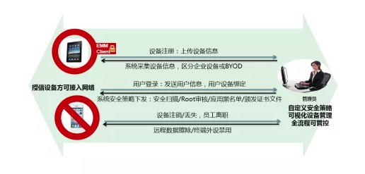 ●接入安全:通過EMM網(wǎng)絡(luò)接入管理和應(yīng)用接入管理,可提供統(tǒng)一的網(wǎng)絡(luò)安全認(rèn)證服務(wù),無論處于什么接入環(huán)境、通過什么接入方式、通過任意的移動設(shè)備均可實(shí)現(xiàn)身份的認(rèn)證、權(quán)限的管理、終端安全檢查、應(yīng)用隧道加密、實(shí)現(xiàn)隔離、流控、擴(kuò)展等非功能機(jī)制,確保只有合法的用戶、合規(guī)的終端才能訪問權(quán)限范圍內(nèi)的企業(yè)應(yīng)用。