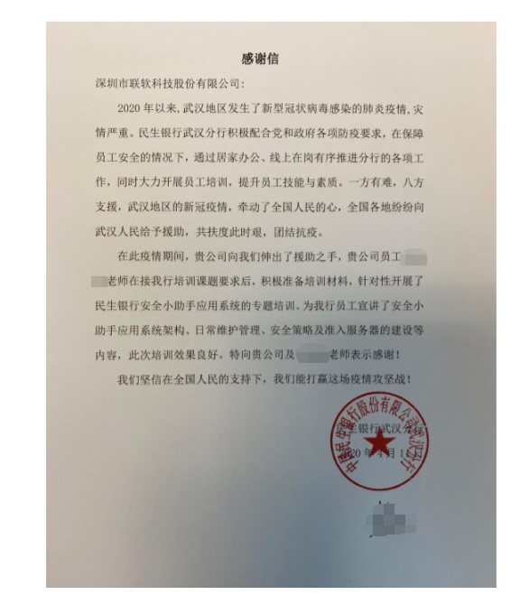 對于民生銀行武漢分行發(fā)來的感謝信,聯(lián)軟科技感到十分的榮幸,并感謝相關(guān)部門同事的各方面支持。在疫情期間,遠程辦公呈現(xiàn)爆發(fā)趨勢,針對遠程辦公可能出現(xiàn)的各項安全威脅,聯(lián)軟科技及時推出了遠程辦公安全解決方案,幫助特殊時期企業(yè)業(yè)務(wù)安全運轉(zhuǎn),一起眾志成城,抗擊疫情!